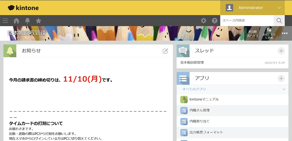 次に目をつけたのはCMで見かけたサイボウズのkintoneで、検索で作り方を調べながらkintoneアプリを作ってみました。簡単な機能のアプリは作れましたが、やりたいことを実装するのは難しく、これから勉強するにしてもその範囲が広かったので開発の依頼を決めました。