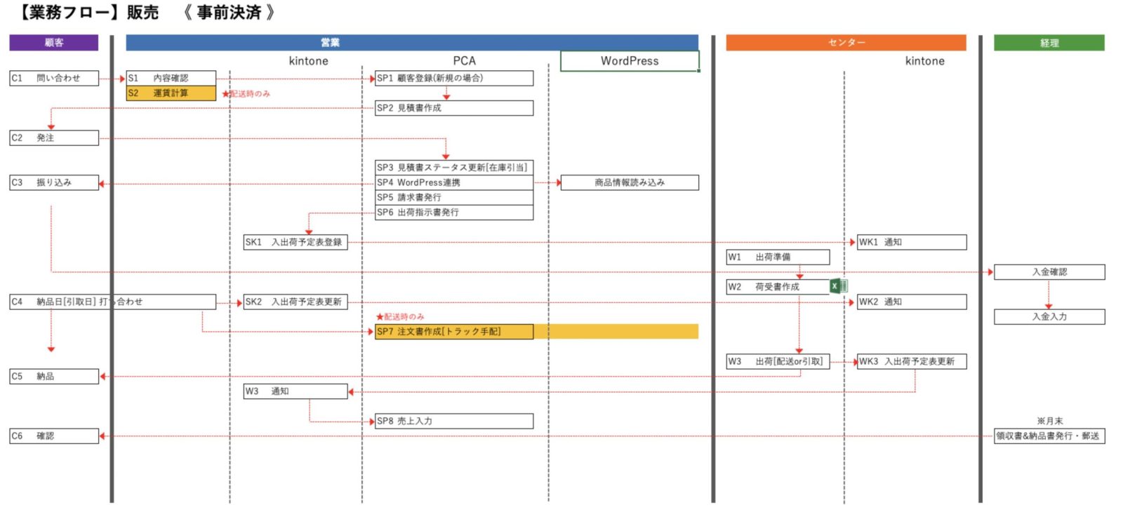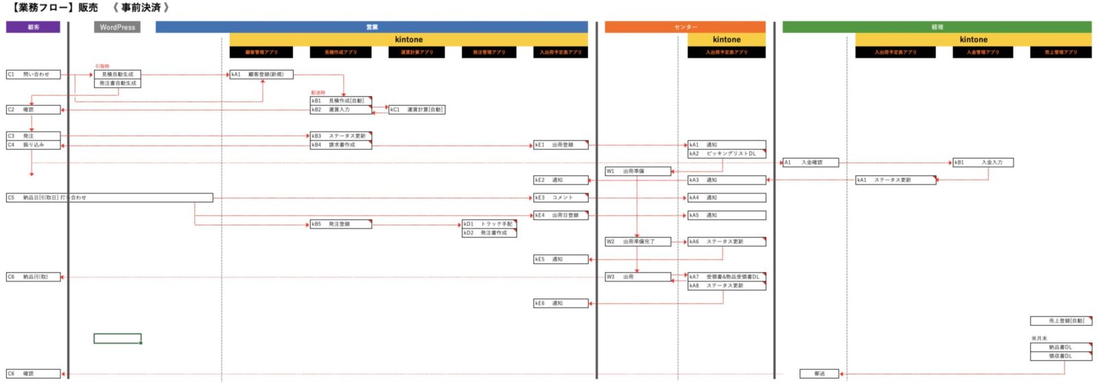 目的が明確になった後、「理想的な業務の流れ」を設計しました。この段階でも、まだkintoneの具体的なアプリ構成は決まっていません。