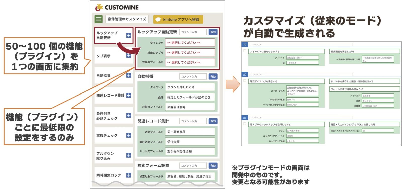 「プラグインモード」をご利用いただくことで、当社が厳選したkintoneで一般的に利用される100種類以上(プランにより約50種類)のカスタマイズの中から、必要な機能を選択し、最低限の項目を設定するだけでカスタマイズが完結します。